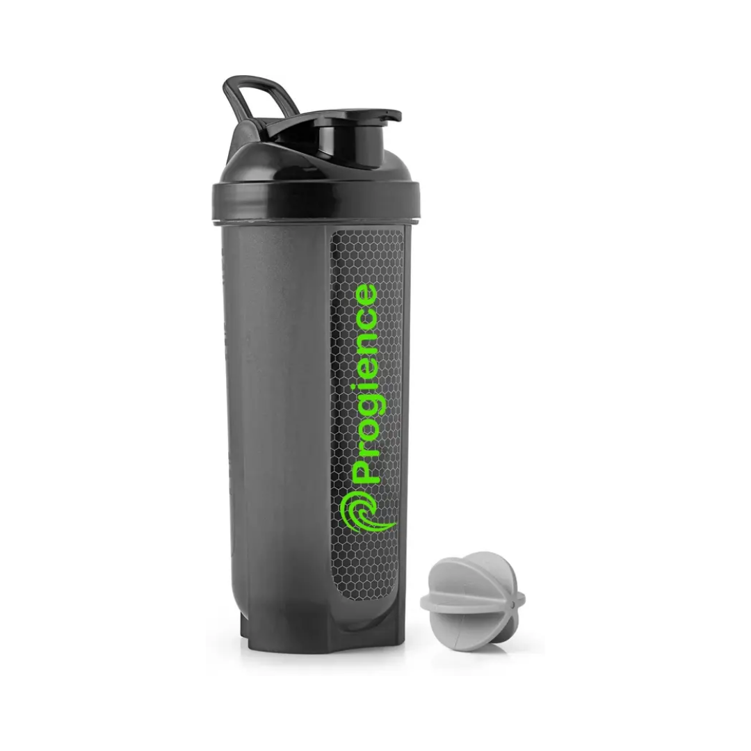 levate your fitness journey with the Progience Gym Shaker Bottle, designed for effortless mixing and convenience. Crafted from BPA-free, high-quality plastic, this 700 ml shaker ensures safe and durable use. The whisk ball technology guarantees smooth, lump-free protein shakes, pre-workout drinks, and meal replacements. Its leak-proof lid prevents spills, making it perfect for gym, travel, or daily use. The sleek black design adds a touch of sophistication, while the ergonomic grip ensures comfortable handling. Stay hydrated and fuel your workouts with this must-have fitness accessory!