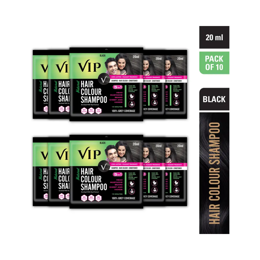 VIP Hair Colour Shampoo Natural Black, Pack of 10 (20ml) For Men & Women | 5-in-1 Instant hair Dye Shampoo | 100% Grey Coverage | Easy-to-use: VIP Hair Colour Shampoo, this shampoo-based hair colour has simplified the way you colour your hair.